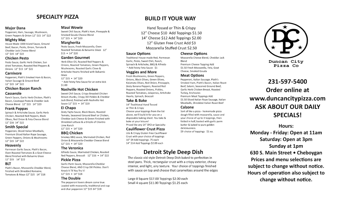 Welcome to Duncan City Pizza, a culinary gem nestled in Cheboygan, MI. This vibrant pizzeria effortlessly blends homemade flavors with creative dishes, making it a must-visit for locals and visitors alike. Whether you're a fan of classic pepperoni or adventurous specialty pizzas, you'll find something to delight your taste buds.